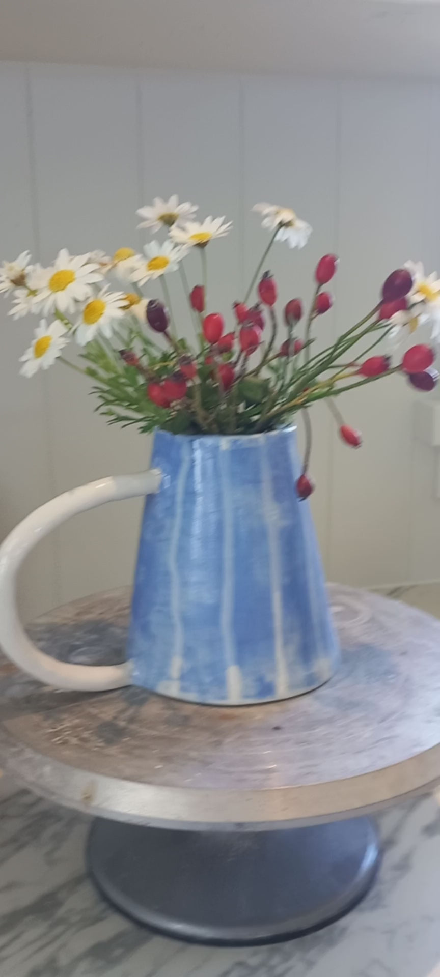 Brightly coloured handmade ceramic jug for your spring blooms. Stands about 150 mm high.