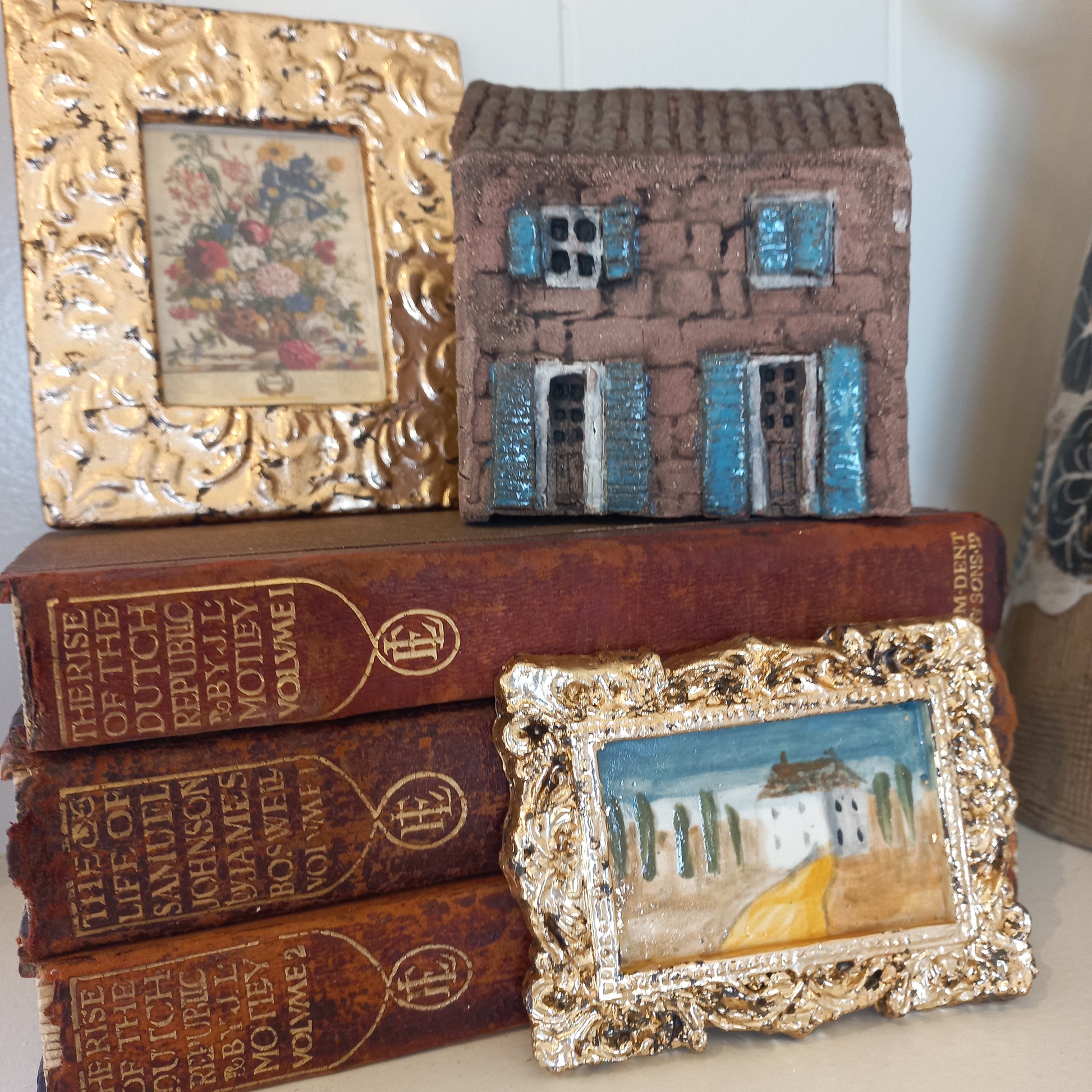 This little handpainted watercolour is framed in a handmade-by-me ceramic gold leaf frame.